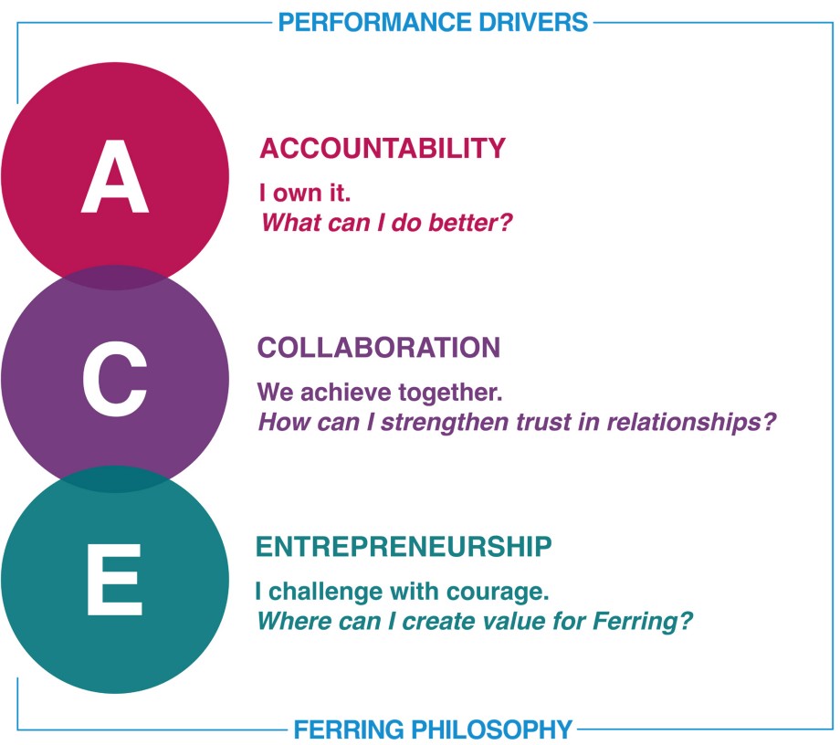 Built on the foundation of our Ferring Philosophy, our performance drivers focus on three key behaviours: Accountability, Collaboration and Entrepreneurship (ACE).